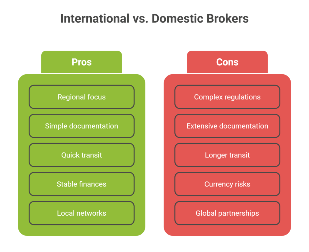 - Regulations and compliance: Domestic brokers handle one set of transport and safety rules, while international brokers must manage import/export laws, customs filings, and tariffs across countries (International Chamber of Commerce [ICC], n.d.).