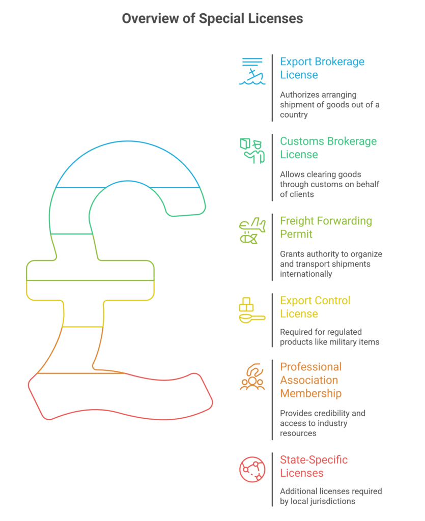 - Export Brokerage License: Authorizes a broker to arrange the shipment of goods out of a country. Ensures compliance with the origin country’s export laws, including documentation, reporting, and legal restrictions.