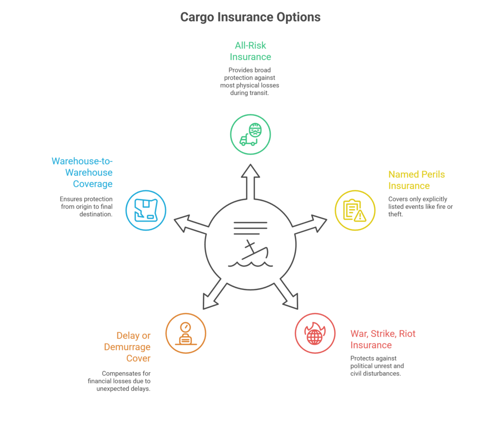 - Delay or demurrage cover: Certain policies can compensate for financial losses caused by unexpected delays, such as demurrage fees or other costs incurred when cargo cannot be unloaded or cleared on time. This is useful for perishable goods or time-sensitive shipments.